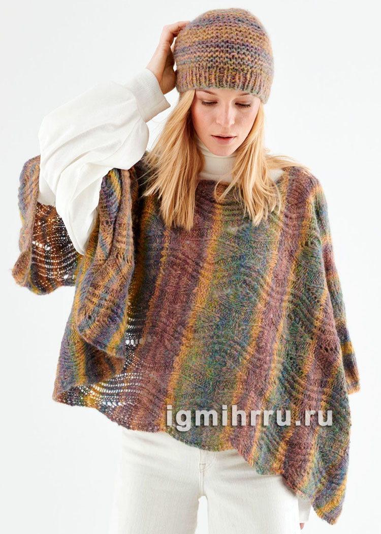 Разноцветный теплый комплект: пончо с ажурным узором и простая шапочка. Вязание спицами со схемами и описанием