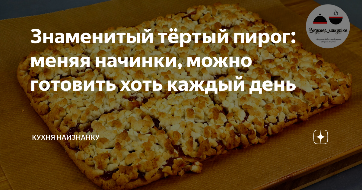 Знаменитый тёртый пирог: меняя начинки, можно готовить хоть каждый день Тёртый пирог. Этот рецепт, я думаю, знают все. С любой начинкой такой пирог получается очень вкусный, а готовится очень просто!