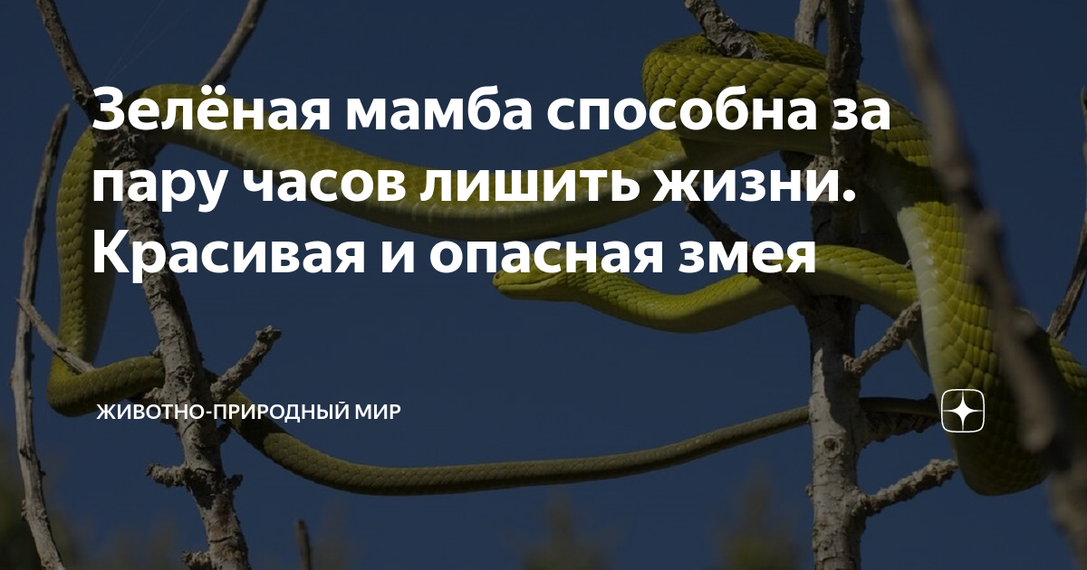 Зелёная мамба способна за пару часов лишить жизни. Красивая и опасная змея Здравствуйте. И вновь у нас рассказ о змее, которая может лишить жизни здорового взрослого человека всего за два часа. Зелёная мамба Фото взято из открытого источника Мы уже не раз рассказывали в наших статьях о мамбах, что этот род очень опасен для человека, но вот о зелёной мамбе мы ещё нигде не упоминали. Это удивительная змея, как вы уже поняли, имеет зелёную окраску, это связано с тем, что