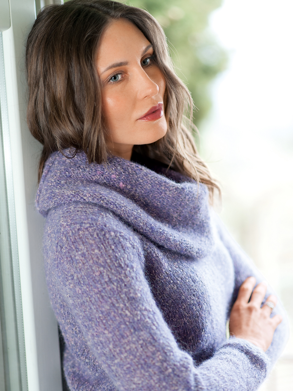 Просто и изящно: джемпер, связанный лицевой гладью из меланжевой пряжи, дополнен широким съемным воротником.
