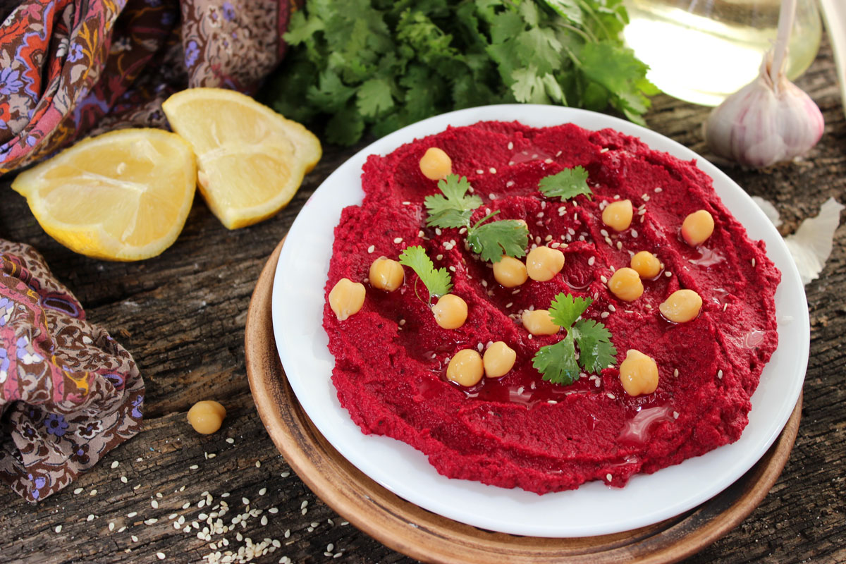 Хумус из нута со свеклой - необычный вкус и фантастически красивый цвет Рецепт свекольного хумуса отличается от классического тем, что нут смешивается со свеклой в соотношении 1 к 1. В итоге хумус приобретает совершенно другой вкус и фантастически красивый цвет! В остальном состав будет точно таким же: пюре из вареного нута, чеснок, лимонный сок, масло, тахини (так называется паста из кунжута), соль и специи. Ингредиенты: Нут вареный …