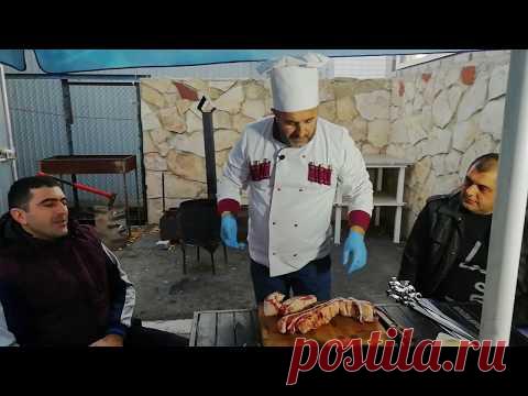Шашлык, ребра из мраморный говядины. Жареные овощи на костре.
