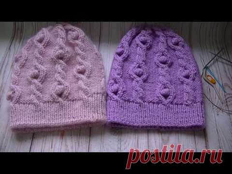 Вязание шапки узором косы с шишечками.