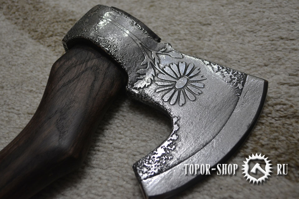 Наш новый кованый топор ручной работы получил название Русское поле. Мы вложили в него всю душу нашей Родины, которая славится бескрайними, сумасшедше красивыми полями. В России самая красивая природа, невероятные рассветы и закаты, леса и поля, горы и долины, реки и моря. На щечках топора нанесен цветок ромашки. Ромашка имеет большие магические свойства, способна соединять влюбленных. Легенду о ромашке читайте на нашем сайте