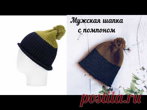 МОДНАЯ ШАПКА С ПОМПОНОМ. Мужская двухцветная шапка. Шапка резинкой 1х1.