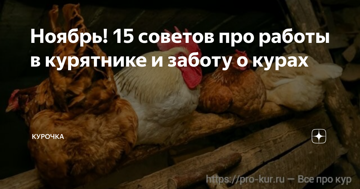 Ноябрь! 15 советов про работы в курятнике и заботу о курах Добрый день, дорогие птицеводы! И вот бодрящие осенние дни уступают место зимнему холоду. Ноябрь. Что проверить в курятнике и как подготовить несушек к зиме – 15 советов в нашем материале.