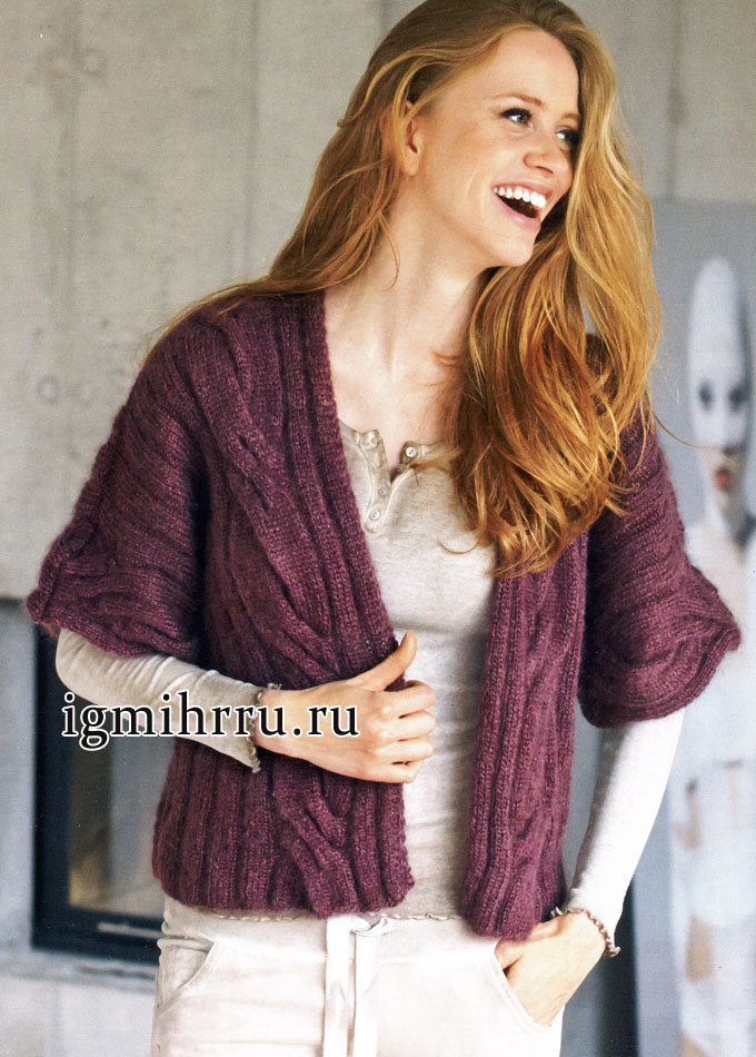 Бордовый жакет с короткими рукавами и узорами из кос. Вязание спицами