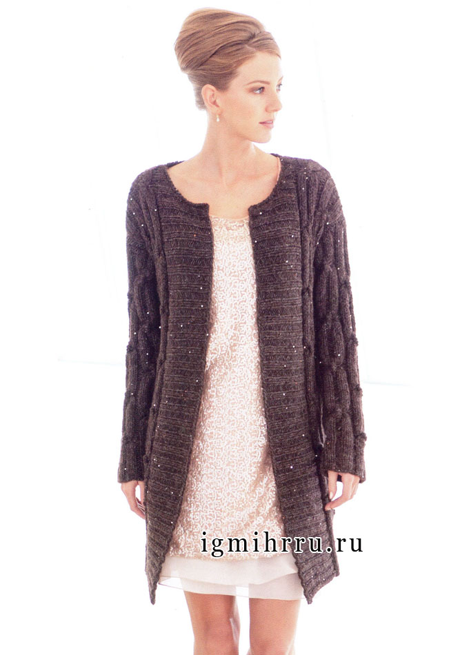 Длинный серо-коричневый жакет с узором из кос, из пряжи альпака с пайетками. Спицы