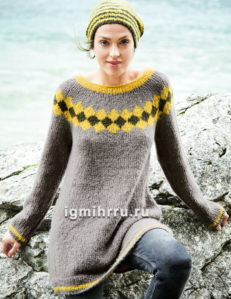 Расклешенная туника с круглой жаккардовой кокеткой. Вязание спицами