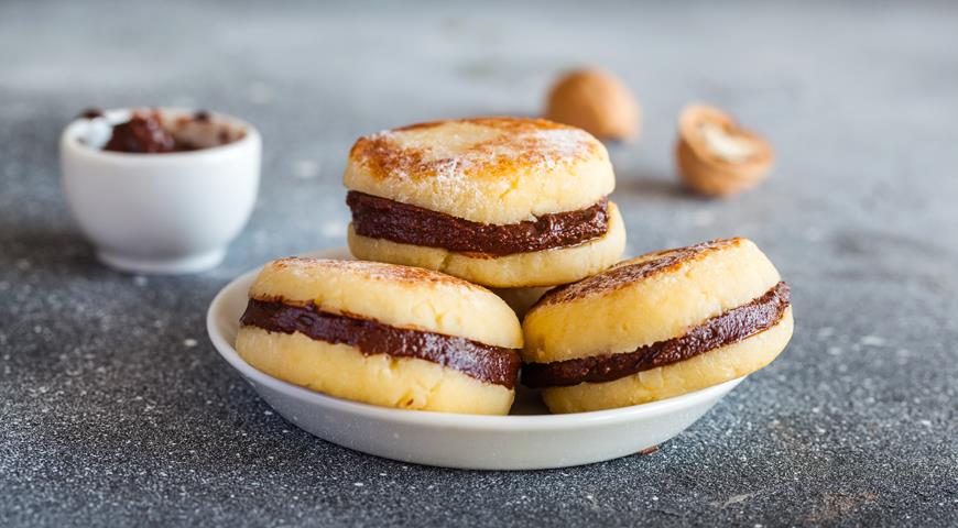 - Холодные сырники разрезать вдоль на 2 равные по толщине части, одну половинку промазать помадкой и накрыть сверху другой. При подаче посыпать сахарной пудрой.
