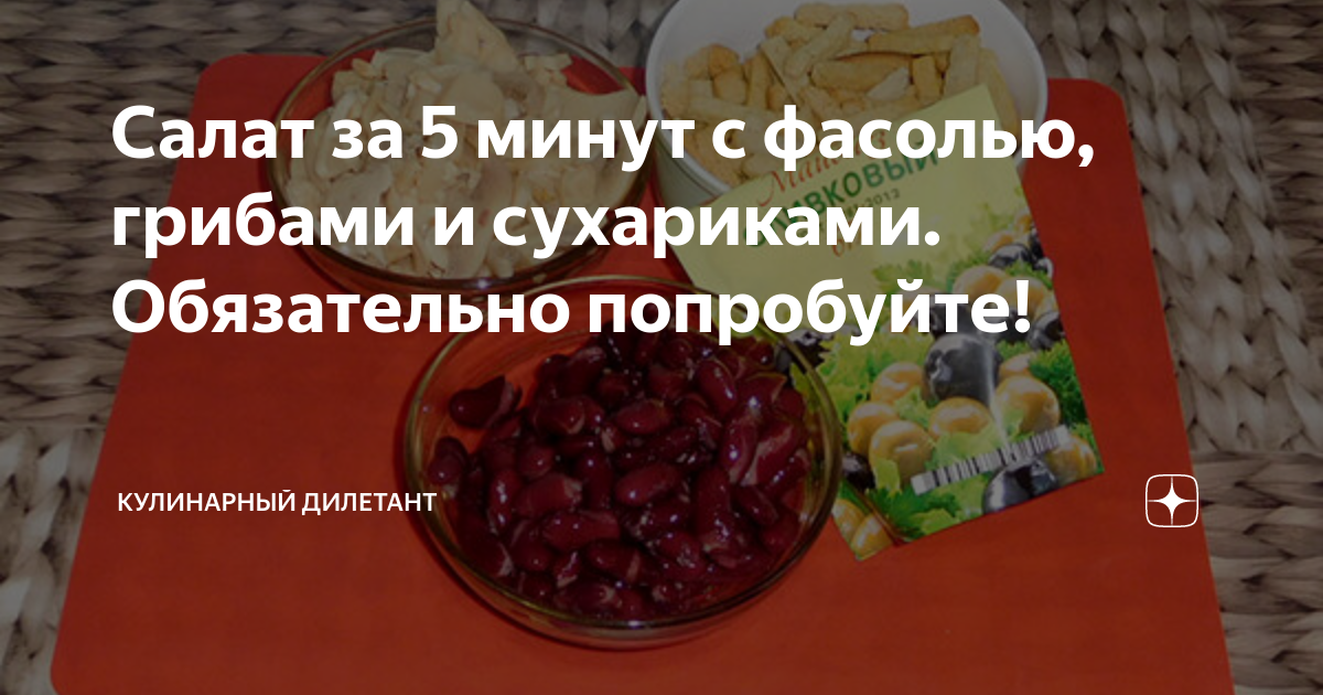 Салат за 5 минут с фасолью, грибами и сухариками. Обязательно попробуйте! Рецепт салатика из категории «гости уже у дверей» и «я жутко проголодался»! Готовим салат с фасолью, шампиньонами и сухариками.