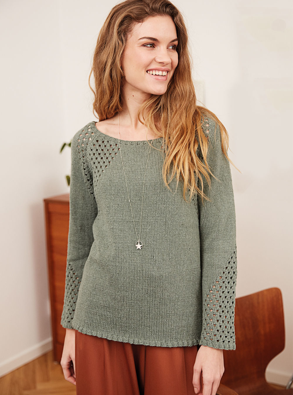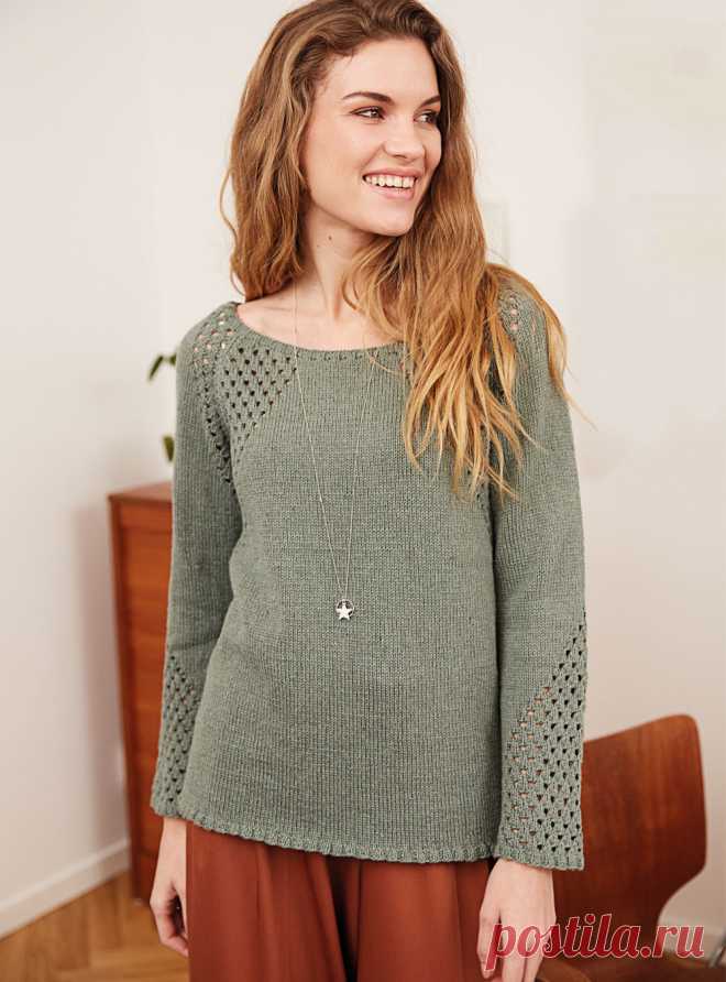 Лаконичная модель становится интригующей, если добавить симметрично расположенные просвечивающие узоры по линии реглана и снизу на рукавах.