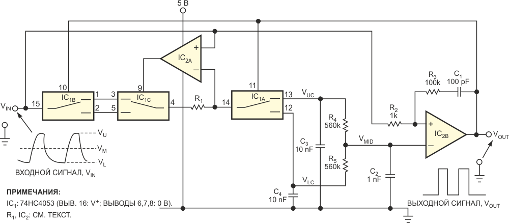 Недорогая схема отслеживания огибающей компенсирует большие изменения сигнала. Не требующая диодов схема с одним источником питания, изображенная на Рисунке 1, восстанавливает ограниченный по полосе поток данных NRZ, коэффициент заполнения которого может меняться от значения менее 5% до более чем 95%, и амплитуда которого может меняться от уровня ниже 100 мВ до напряжения шины питания, например, до 5 В. Более того, схема нечувствительна к среднему уровню сигнала, изменяюще...
