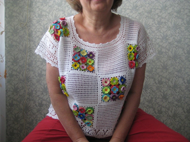 White crochet top with voluminous multi-colored flowers. Ready | Etsy