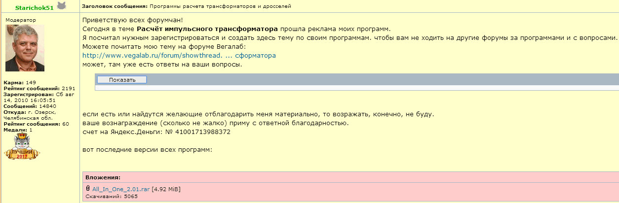 Программы расчета трансформаторов и дросселей. Я посчитал нужным зарегистрироваться и создать здесь тему по своим программам. чтобы вам не ходить на другие форумы за программами и с вопросами. Вложения: All_In_One_2.01.rar [4.92 MiB]
