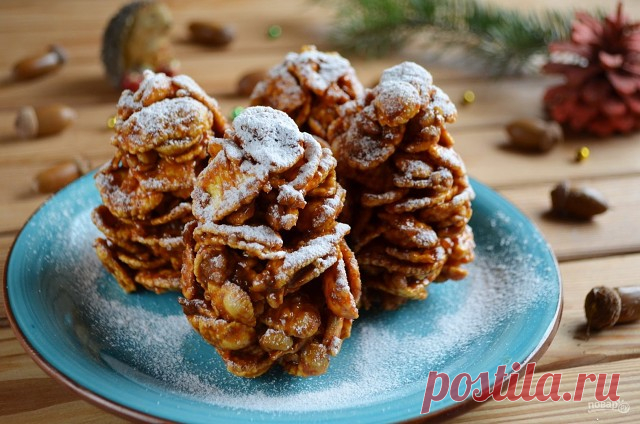 Десерт "Еловые шишки" на Новый Год Моя дочка, увидев десерт, радостно захлопала в ладоши! Ведь десерт и правда похож на самые настоящие елочные шишки! Я присыпала их сахарной пудрой, как легким снежком... Красота, правда? Смотрите и запоминайте, как приготовить десерт "Еловые шишки" на Новый год. Ингридиенты: Кукурузные пластивцы: 90 Грамм, Грецкие орехи: 0,5 Стакана (очищенные), Сгущенка "Ириска": 180 Грамм (вареная), Сахарная пудра: 1 Ст. ложка (для украшения) При...