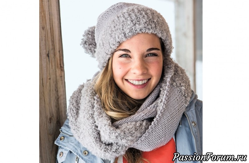 Шапка и снуд из пряжи букле. Описание - запись пользователя ШАПОкляк (Сима) в сообществе Вязание спицами в категории Вязание спицами аксессуаров Отличный комплект из шапки с помпоном и связанного по диагонали снуда, основанный на сочетании буклированной и гладкой пряжи. Никаких дополнительных узоров таким аксессуарам не требуется.