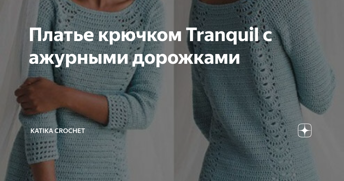 Платье крючком Tranquil с ажурными дорожками Платье связано из пряжи цвета мяты. Четыре ажурных вертикальных полосы украшают платье по две спереди и две сзади. Ажурные полосы расположены по краю платья. Низ полочки и спинки, а также низ рукавов, также украшены узором «сетка». Платье вяжется единым полотном и не имеет швов. Широкий вырез горловины — показывает красивую линию плеча. Платье длиной выше колена демонстрирует красивые и стройные