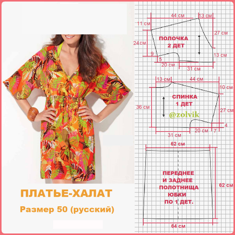 ПЛАТЬЕ-ХАЛАТ Платье с цельнокроеными рукавами длиной ниже локтя. Материалы: батик, шармез, линон, креп-жоржет, шитье, газ, жаккард, мягкие легкие виды льна, различные виды шелка. При работе с материалами с рисунком, требующим подгонки, расход мате- риала увеличивается