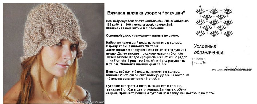 Шляпка связанная узором "ракушки" Тут же описание,схема