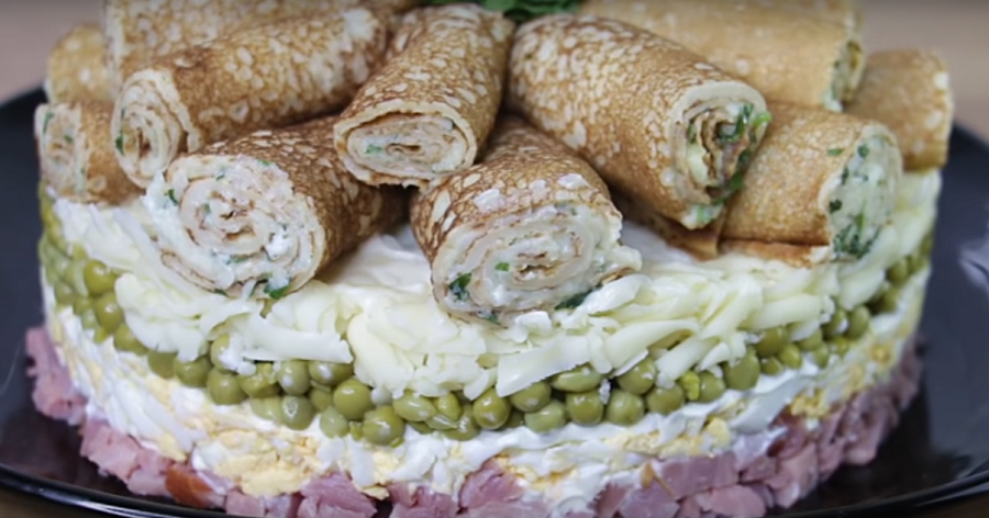 Красивый праздничный салат с блинами