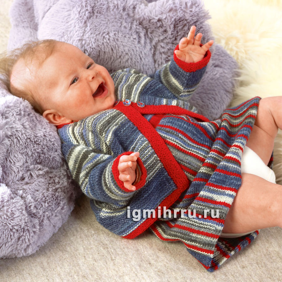 Для малышки в возрасте до 1 года. Меланжевый жакет с красными планками. Вязание спицами для самых маленьких детей со схемами и описанием