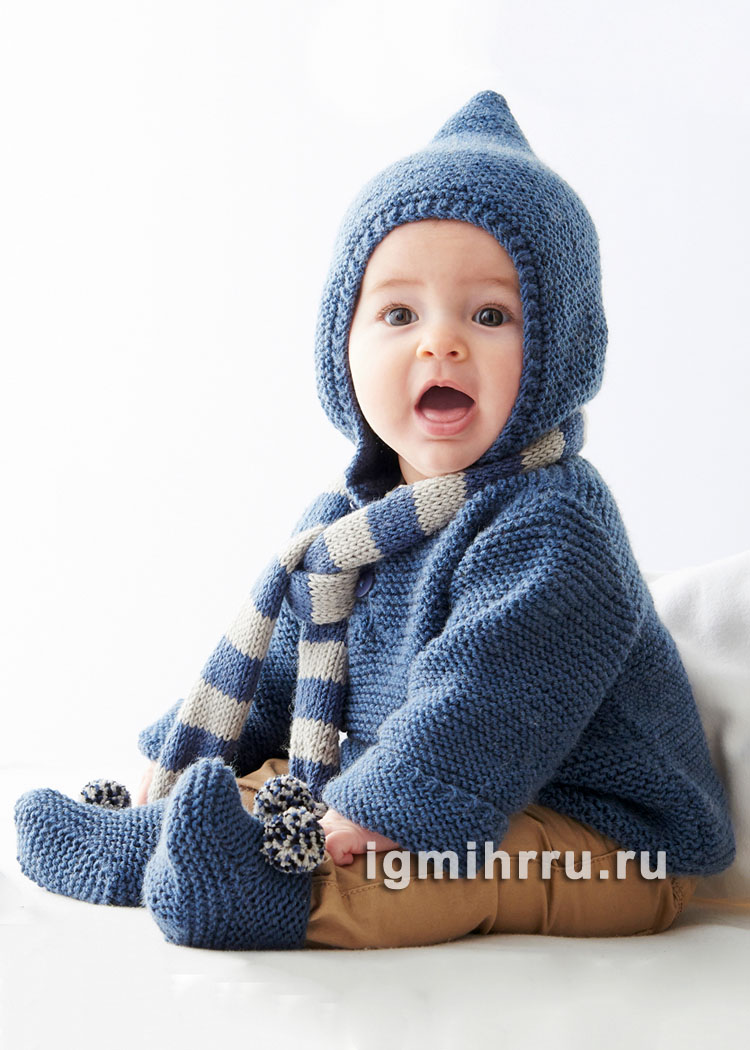 Для малыша в возрасте до 12 месяцев. Пуловер с капюшоном, шарфик и пинетки. Вязание спицами для самых маленьких детей со схемами и описанием