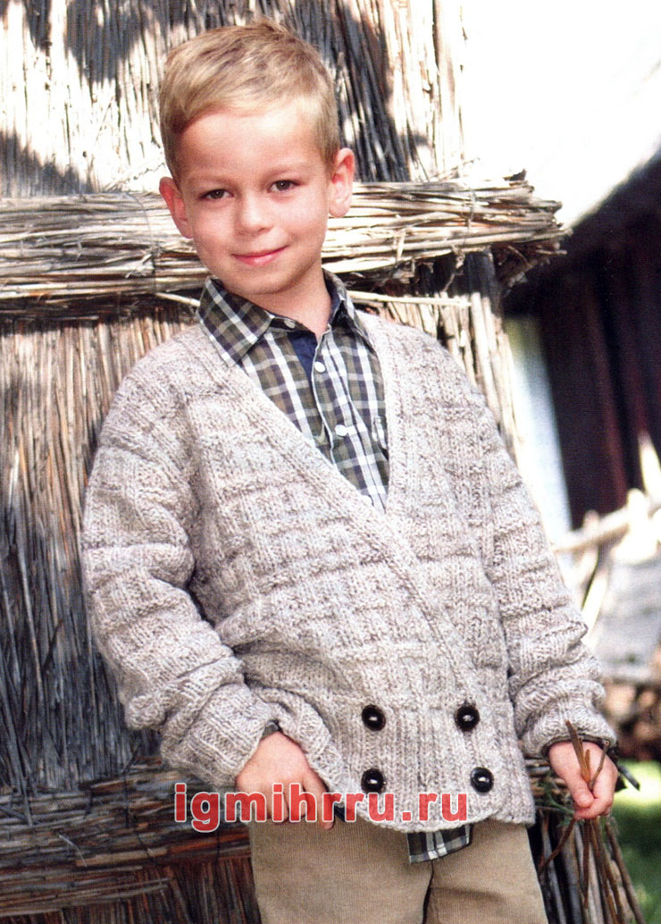 Для мальчика 5-13 лет. Двубортный жакет с рельефным узором. Вязание спицами для мальчиков со схемами и описанием