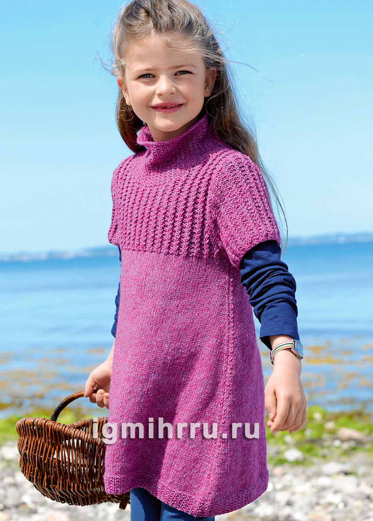 Для девочки 3-9 лет. Туника с воротником-стойкой и кокеткой из «кос». Вязание спицами для девочек