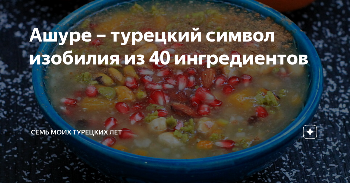 Ашуре – турецкий символ изобилия из 40 ингредиентов Вчера закончился месяц Ашуре. И я успела это блюдо приготовить и соседей угостить. Значит, будет нам изобилие – примета такая. Расскажу об этой удивительной каше из 40 ингредиентов, потому что она крутая. И я обожаю ритуальную еду, которая со смыслом. Как оливье в новый год, как блины на масленицу, как кутья в сочельник