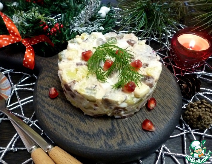 - Залить нарезку приготовленной заправкой и аккуратно перемешать.