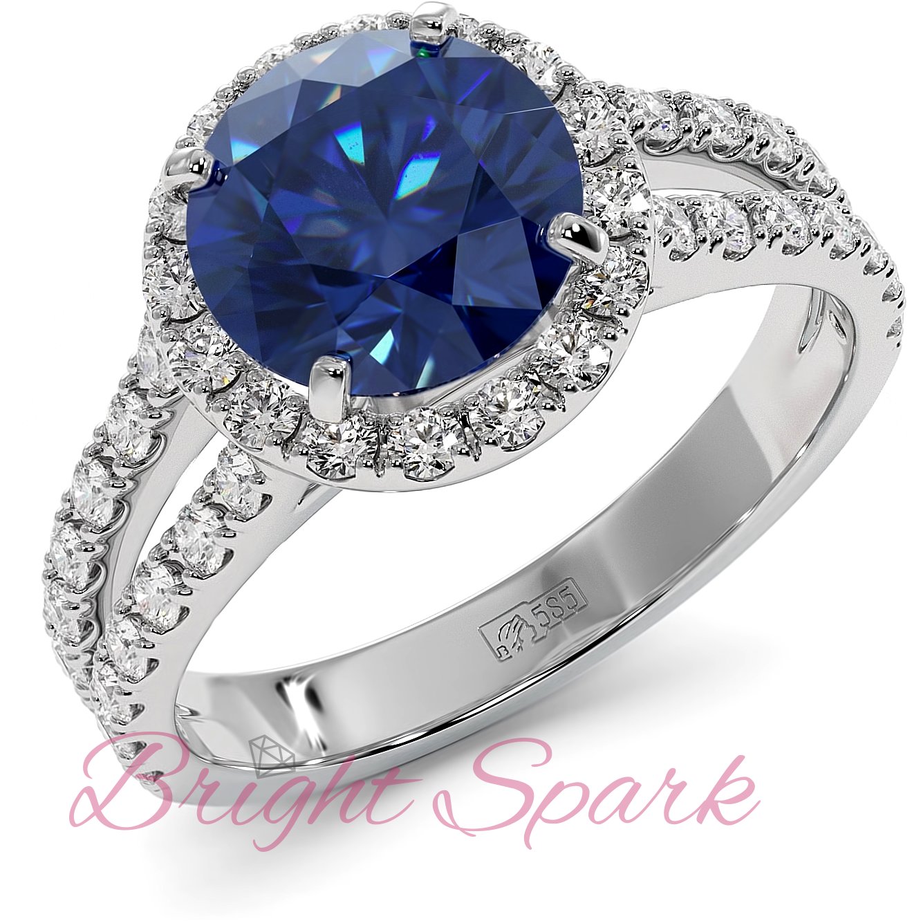 Золотое кольцо с центральным сапфиром и россыпью белых камней Brenda 2,7 карата Красивое кольцо с геотермальным сапфиром 2,28 карата Bright Spark (неотличим от натурального камня) в центре и ореолом белых муассанитов из золота в дизайне Тиффани (полный аналог бриллианта)
