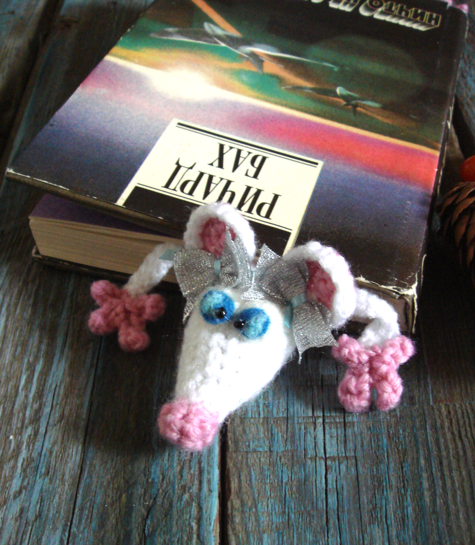 Весёлая закладка в технике амигуруми. Символ Нового года белая крыска Снежа. Сделает чтение вашего ребёнка и ваше весёлым, поднимет настроение, даже если вы читаете самый страшный роман ужасов :) По всем вопросам усыновления пишите в директ. https://www.etsy.com/shop/JuLioToysand?ref=seller-platform-mcnav