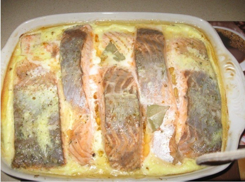Рыба, запеченная в сметане Ингредиенты: - 2 кг рыбы (хек, минтай) - 3 головки лука - 2 яйца - 150 г сыра твердых сортов - 400 г сметаны - растительное масло - мука - маленький пучок укропа - специи, соль и горчица по вкусу Приготовление: 1. Рыбу помыть, почистить, нарезать небольшими кусочками. 2. Сделать панировку: в плоское блюдо насыпать муку, соль, специи и перемешать. 3. В панировке обвалять кусочки рыбы и выложить на противень с бортиками. 4. Нарезать лук полукольцами и обжарить на расти