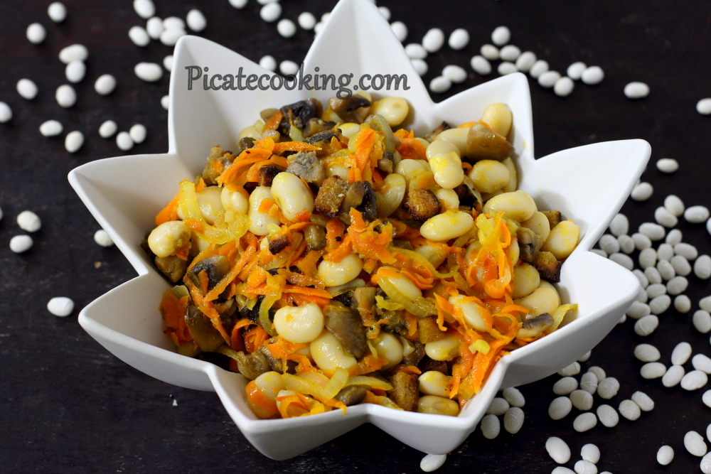 Пісний салат з квасолею та печерицями Багатий як смаком, так і консистенцією, пісний квасолевий салат з печерицями, хрусткими грінками, часником та морквою.