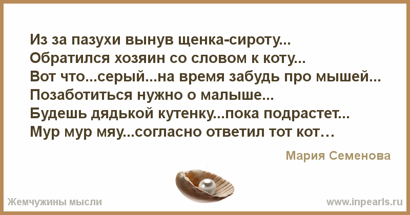 Из за пазухи вынув щенка-сироту... Обратился хозяин со словом к коту... Вот что...серый...на время забудь про мышей... Позаботиться нужно о малыше....