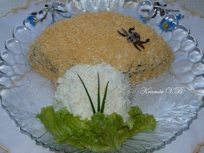 Салат выкладываем слоями в виде гриба:картофель,грудка,грибы,сыр,яйца.Слои немного подсолить и промазать майонезом.Приятного аппетита!!!!!