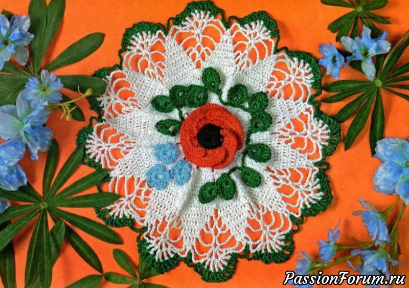 Салфетка с цветочками. Схема - запись пользователя Фантазии крючком (Полина) в сообществе Вязание крючком в категории Вязаные крючком аксессуары Филейное вязание. Материалы: пряжа «Лилия» (100 % хлопок), 20 г белой; пряжа «Ирис* (100 % хлопок), 3 г зелёной, 2 г красной, немного чёрной и голубой; крючок № 1,3. Диаметр: 22,5 см. Описание работы: пряжей белого цвета набрать цепочку из 10 в.