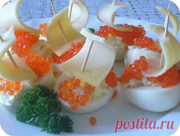 Кораблики из яиц с икрой. Ингредиенты: - яйца - сыр - красная икра - майонез - соль, перец Приготовление: Эта великолепная закуска очень проста и легка в приготовлении. Нужно отварить столько яиц, сколько пар корабликов вы хотите получить. Из одного сваренного вкрутую яйца выходит два кораблика. Разрезаем яйца вдоль на две части, вынимаем желток. Натираем на терке сыр. Желток растереть с солью, черным перцем, сыром и майонезом. Полученной начинкой заполняем половинки б...