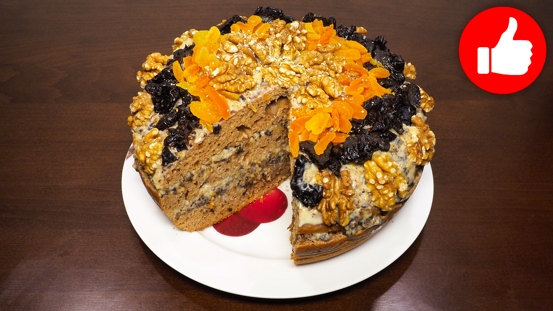 - Это простой и вкусный торт обязательно оценят по достоинству ваши гости, а так же вся ваша семья. Подробности и детали приготовления вы можете посмотреть в моем коротеньком видео рецепте ниже. Приготовим тесто: взбить яйца с сахаром, добавить кефир, муку, разрыхлитель и какао. В смазанную маслом чашу выложить тесто и готовить в мультиварке на режиме "мультиповар 125 С" или режиме "выпечка" 1 час. Для крема измельчить орехи, курагу и чернослив. Отдельно смешать мягкое масло и сгущенное молоко. Смешать обе массы. Готовый бисквит разделить на 3 коржа. Каждый слой промазать кремом. Сверху торт украсить курагой, черносливом и орехами. Перед подачей на стол дать торту пропитаться и настояться в холодильнике не менее 2 часов.