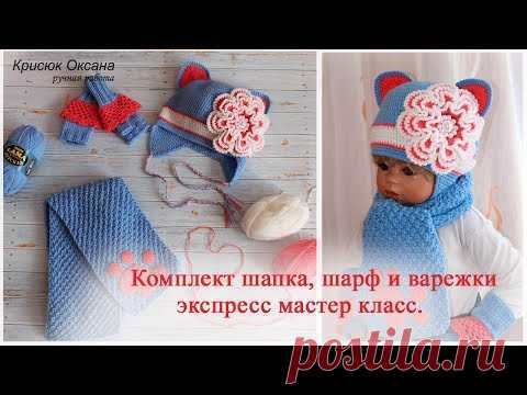 Вязание крючком. Детский комплект крючком шапка, шарф и митенки, экспресс МК