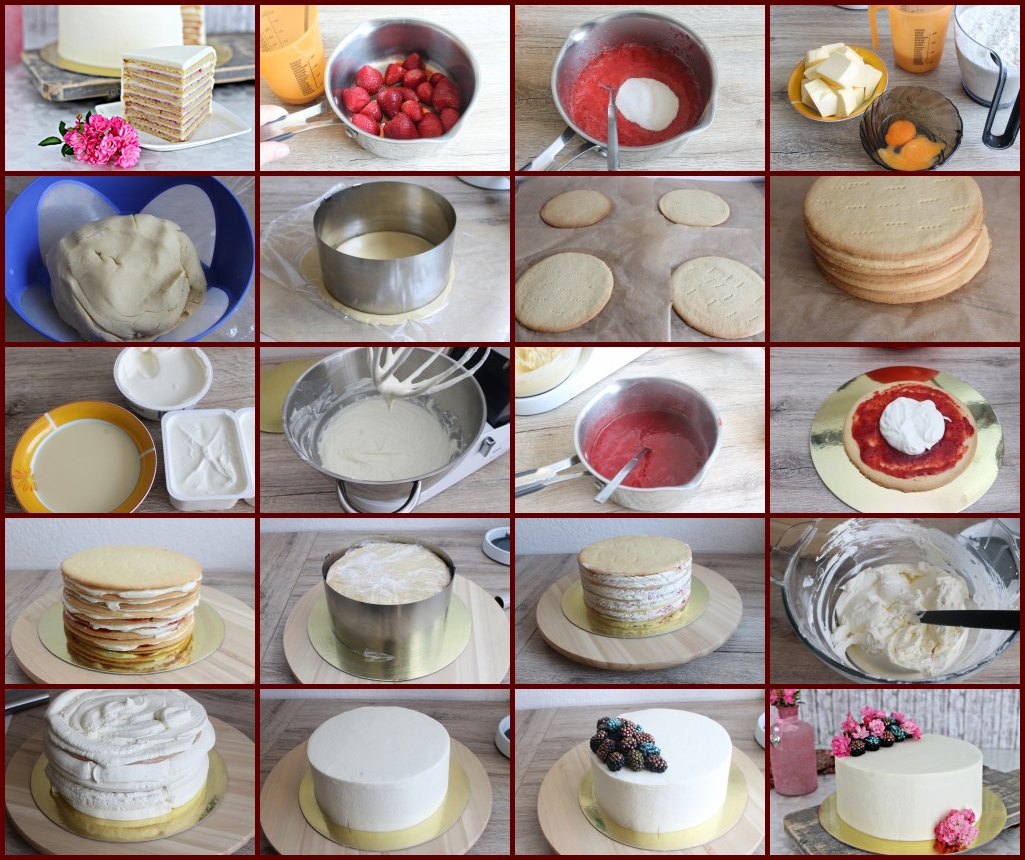 - Шаг 1: Делаем сначала джем.Разморозим клубнику или берем свежую.Шаг 2: Пюрируем. Добавим к ней сахар с пектином.Ставим на огонь и варим 10 минут.Шаг 3: Подготовим продукты для теста. Все взвешиваем на весах.Масло берем мягкое.Шаг 4: Мягкое масло взбиваем с сахаром, можно добавить щепотку соли.Далее кладем яйцо и желток.Все размешиваем и добавляем муку с содой. Муку подсыпать нужно частями. Потому что у всех она разная, может понадобится меньше. У меня ушло гдето 400гр.Шаг 5: Уберите тесто в холодильник на 15 минут.Шаг 6: Затем делим тесто на части. Можно на 8 частей или взвешиваем кусочки по 140гр. Раскатываем на бумаге через пленку и вырeзaем сразу круг, у меня 20см.Из остатков получится еще один корж.Шаг 7: Тесто накалываем вилкой. Вот такие коржи у нас будут. Тем временем включаем духовку на 190гр. И выпекаем до светло-золотистого цвета по 5 минут. Я делала сразу по два листа и включала режим вентилятор.Шаг 8: Даем им остыть.Шаг 9: Вот такая стопочка коржей получилась у меня.Шаг 10: Делаем крем. Для этого подготовим творог, сгущенку и маскарпоне.У меня жидкий творог. Если у вас сухой творог, его надо перетереть через сито и можно добавить 50мл сливок.Шаг 11: Все ингредиенты кладем в чашу миксера и взбиваем.Шаг 12: Теперь будем собирать торт. Джем у нас остыл, он загустел.Шаг 13: Итак, кладем первый корж ,на него 2-3 чайные ложки джемаи размазываем.Шаг 14: Теперь крем творожный. Примерно 4-5 столовых ложек.Шаг 15: Итак далее. Верхний корж не обмазываем.Бока тоже обмажем слегка кремом. Торт будет немого подвижный. Можно было сразу выкладывать в кольце. Но я делаю всегда так.Шаг 16: Далее обернем пленкой все и обтянем кольцом. Убираем на ночь в холодильник.Шаг 17: Утром он у нас вот так будет выглядеть.Теперь делаем крем для обтяжки.Шаг 18: Сливки и маскарпоне должны быть очень холодными. Венчик можно на пару часов убрать в морозилку. Все затем кладем в чашу миксера и взбиваем. Сахарную пудру добавляем сразу тоже. Кому то может понадобится больше, я пробую на вкус. Не все любит слишком сладкое.Нельзя перебить крем. Поэтому надо вовремя остановиться.Шаг 19: Набираем в кулинарный мешок крем и обмазываем вокруг торта.Шаг 20: Далее быстро работаем специальным шпателем для тортов. Убираем лишний крем и вуаля! Ровненький тортик!Шаг 21: Украшаем как хотим.Я украсила ягодами. Обмазав их кондурином.Такой торт нужно подавать через 3 часа. Убираем его сразу в холодильник. На следующий день такой крем может треснуть сверху , имейте ввиду.Поэтому лучше подавать в этот день.Шаг 22: Если цветами будете украшать, то нужно протереть стебли водкой и зaвернуть в пленку.Шаг 23: Все, приятного аппетита!