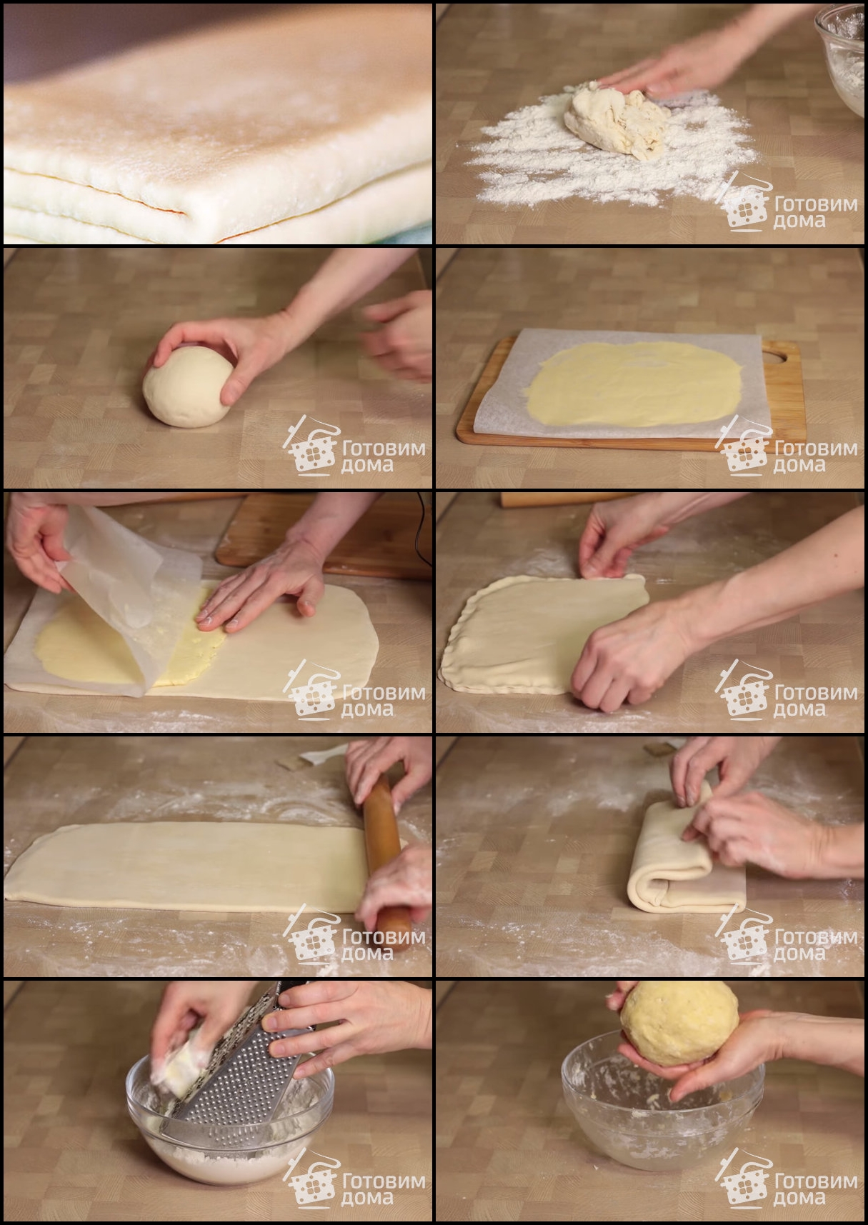 Слоеное бездрожжевое тесто – 2 варианта Классический рецепт мука 300 г масло сливочное 200 г вода 130 г соль 1/4 ч.л. сок лимонный 1 ч.л. Быстрый рецепт мука 300 г масло сл. подмороженое 150 г вода ледяная 100 г соль 1/4 ч.л. сок лимонный 1 ч.л.