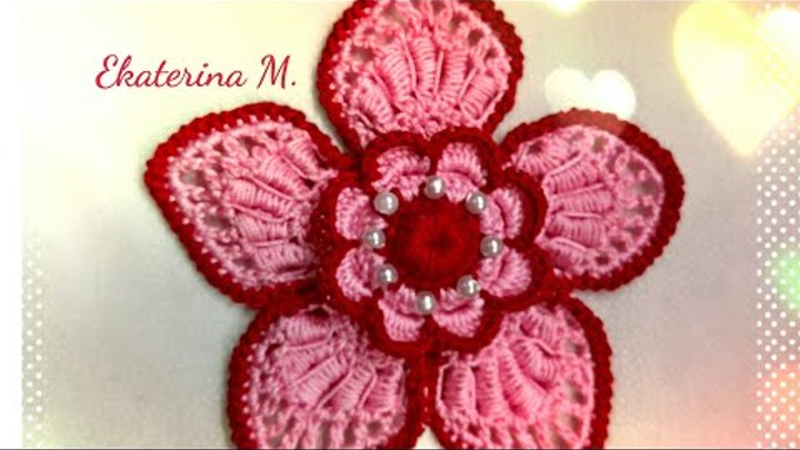 Цветок с бусинками и ажурными лепестками, связанный крючком для Ирландского кружева.
