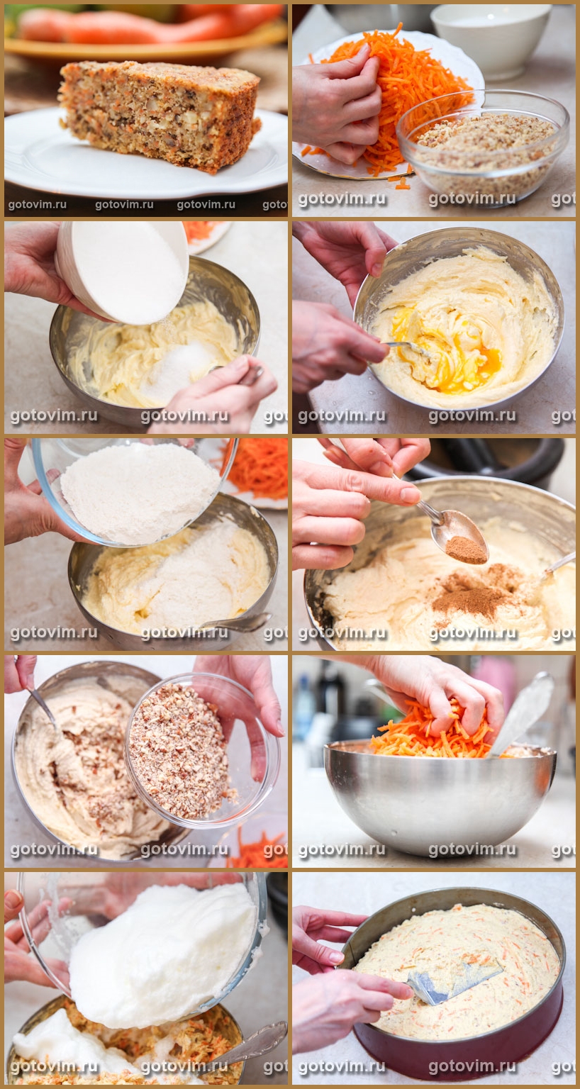 - Морковь вымыть, почистить и натереть на терке (средний размер отверстий). Орехи измельчить в процессоре до крупной крошки. Муку просеять и смешать с разрыхлителем и солью.