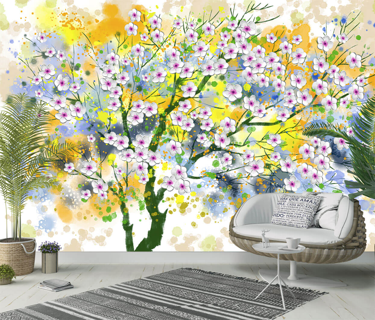 3Д обои с цветущим деревом на ярком акварельном фоне
