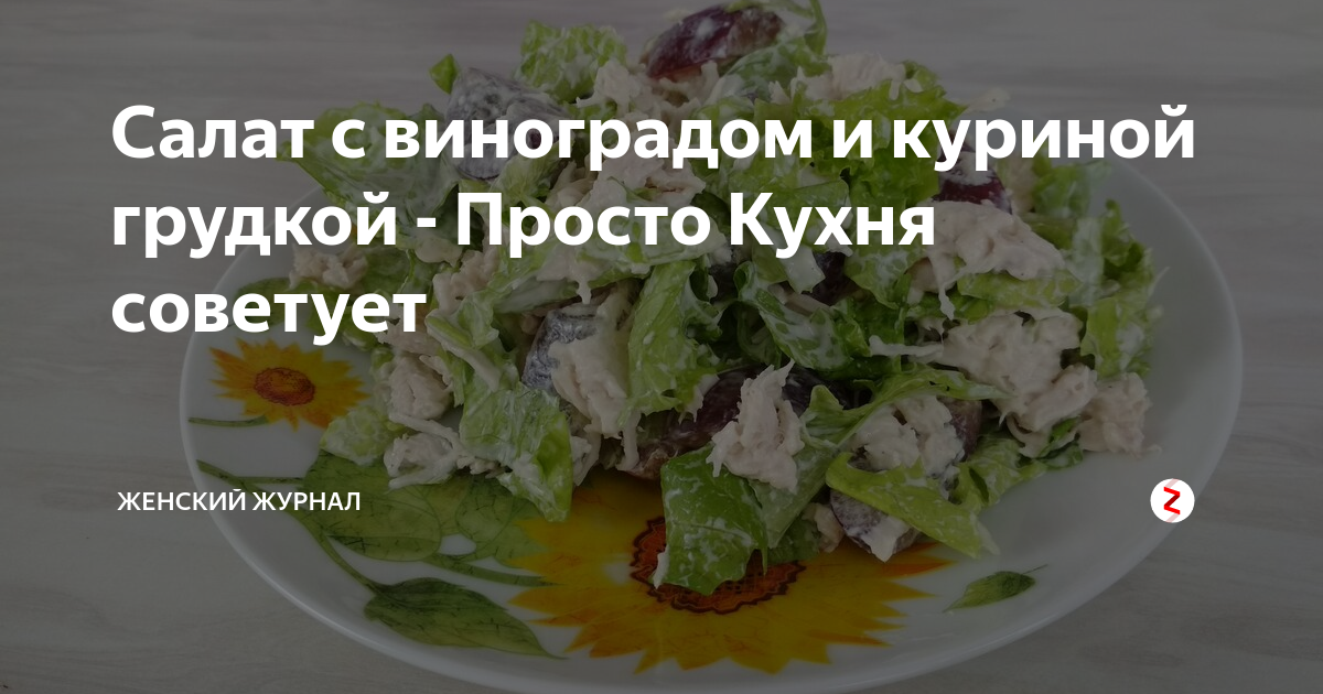 Салат с виноградом и куриной грудкой - Просто Кухня советует Хотите удивить своих близких чем то необычным, не знаете что приготовить? Тогда приготовьте салат с виноградом. Таким салатом можно украсить и праздничный стол! Рецепт салата с виноградом пошагово смотрите в нашем видео. Нам понадобятся: куриная грудка - 2 - 3 шт