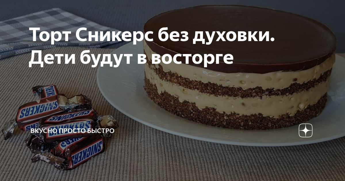 Торт Сникерс без духовки. Дети будут в восторге Настоящее наслаждение для сладкоежек! Любителям шоколадки Сникерс – этот торт должен понравиться. Торт готовится без выпечки, легко и просто, очень вкусный и на детских праздниках съедается моментально! Ингредиенты рассчитаны на торт диаметром 18 см