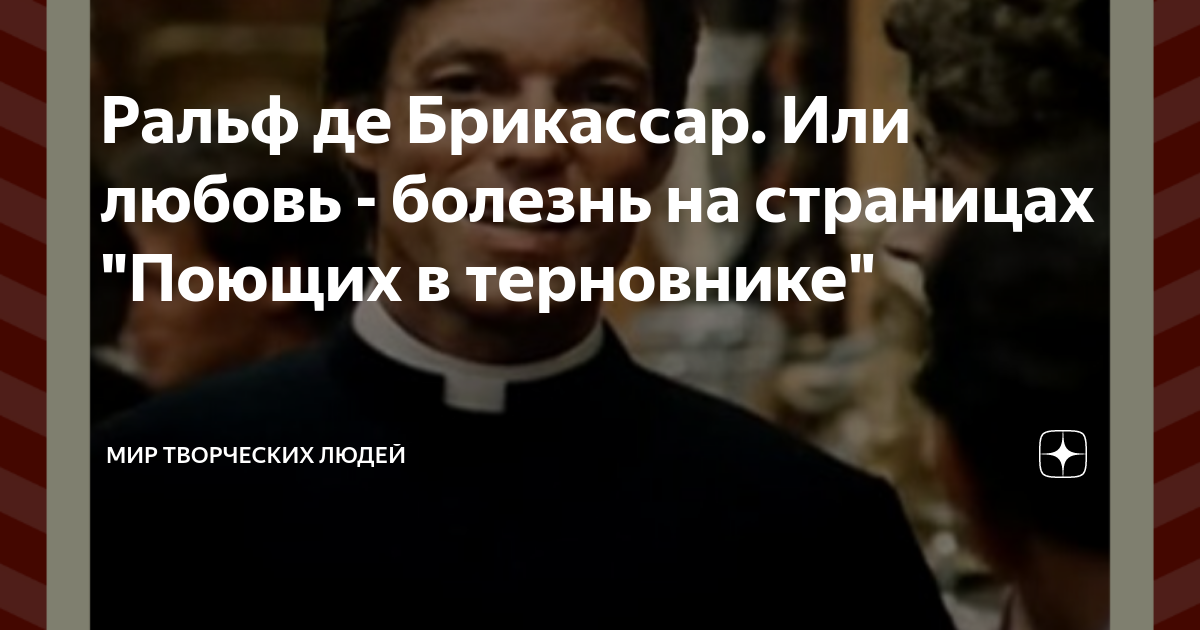 Ральф де Брикассар. Или любовь - болезнь на страницах "Поющих в терновнике" Любовь - штука сложная. И главная трудность состоит в том, что людям свойственно тянуться к запретному плоду, жаждать его, мечтать о нем. Это в равной мере присуще мужчинам и женщинам, молодым и старым. Сколько бы вариантов ни было, большинство выберут именно тот, что принесет максимальное количество проблем.