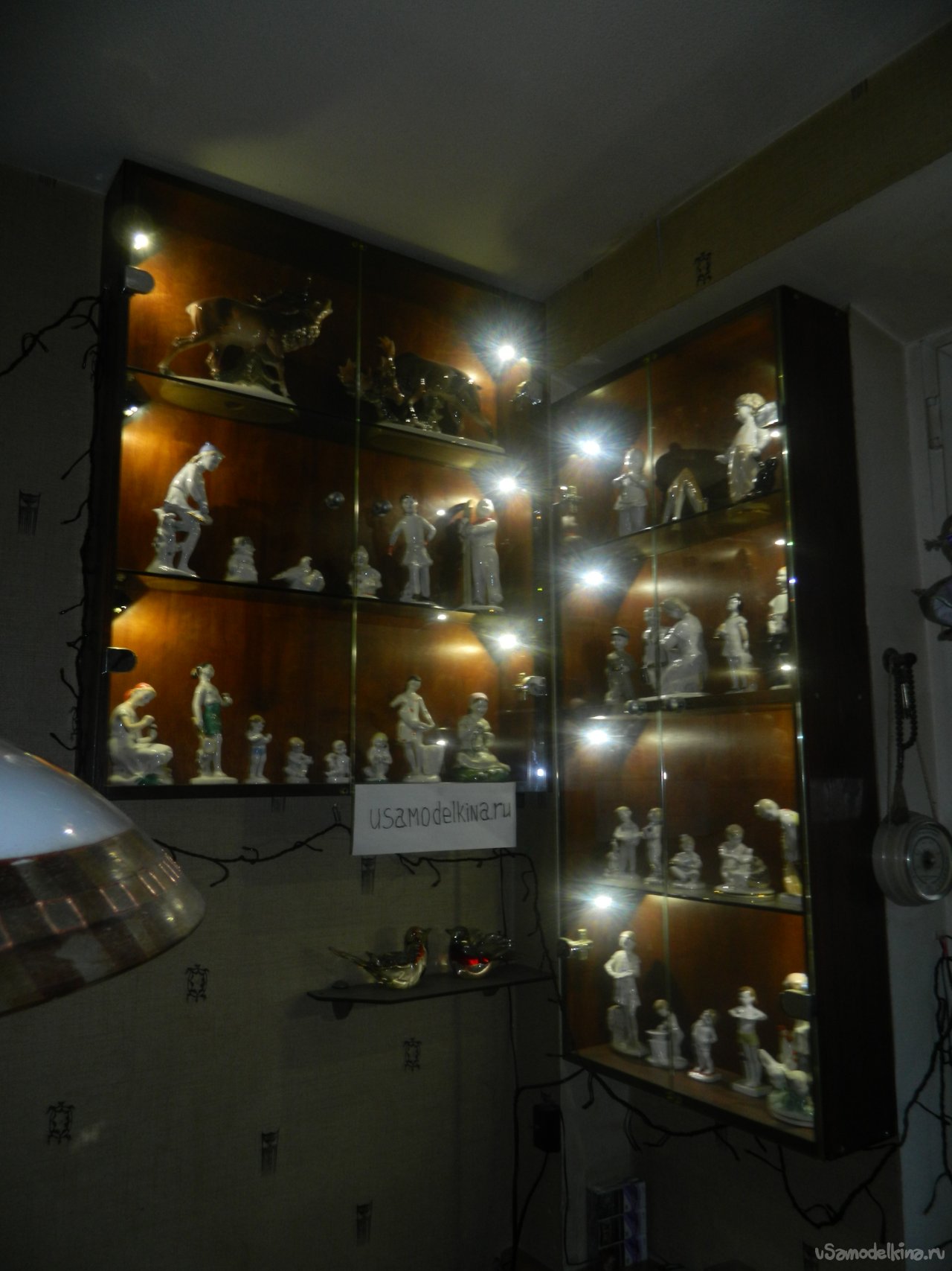 Закрытые витрины со стеклом и подсветкой Коллекцию фарфоровых фигурок с завода ЛФЗ жена уже давно начала собирать (стоят дорого!). Уже набралось достаточно большая коллекция. Когда-то я сделал стеклянные полки на стенах — смотрелись, как открытая витрина.Подсвечивали витрину маленькие самодельные прожектора с двумя режимами работы: